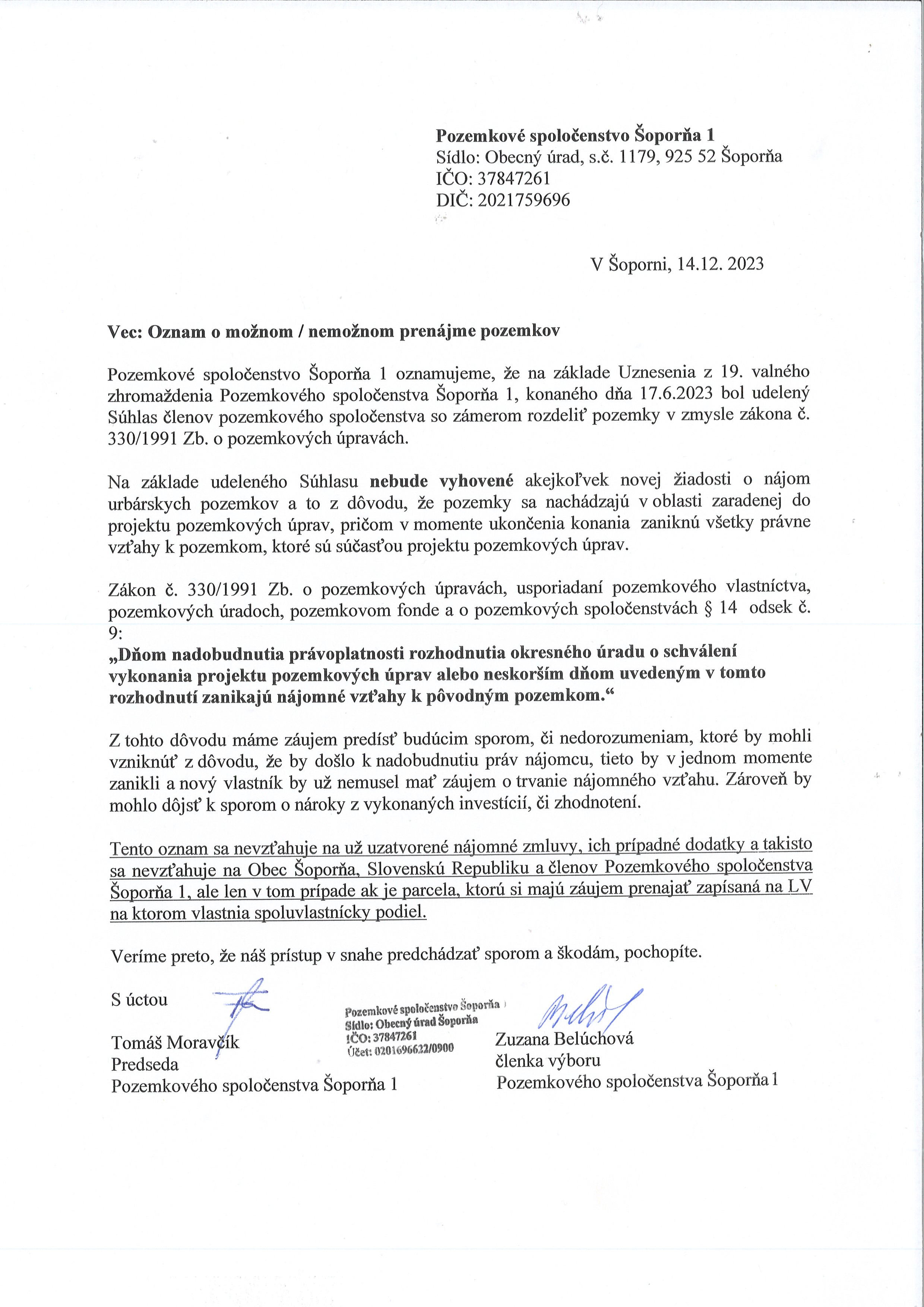 Oznam o možnom / nemožnom prenájme pozemkov