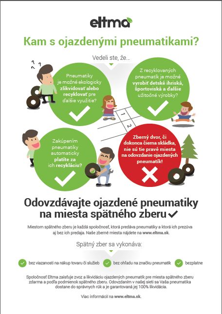 Ojazdená pneumatika nepatrí na zberný dvor obce ani na čierne skládky. Takéto pneumatiky máme možnosť odovzdať distribútorom pneumatík - pneuservisy, autoservisy, predajne pneumatík, predajne automobilov atď. - ktorí sú označení ako "Miesto spätného odberu pneumatík" a to úplne BEZPLATNE. Zoznam týchto zberných miest nájdete na webovej stránke eltma.sk v sekcii "Zberné miesta". Info v prílohe....